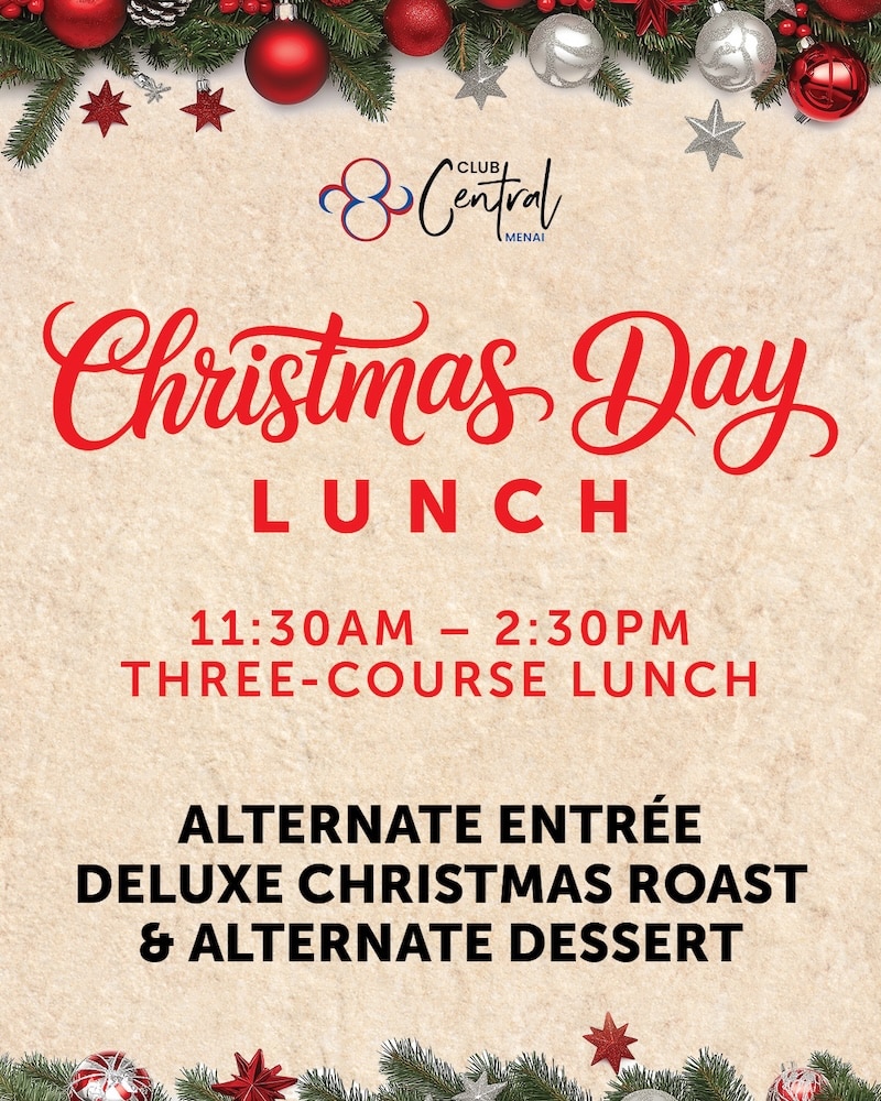 Celebrate Christmas with a relaxed three course set menu at Club Central Menai. It is a lovely way to enjoy the day without the stress of cooking, with a menu designed to suit the whole family.